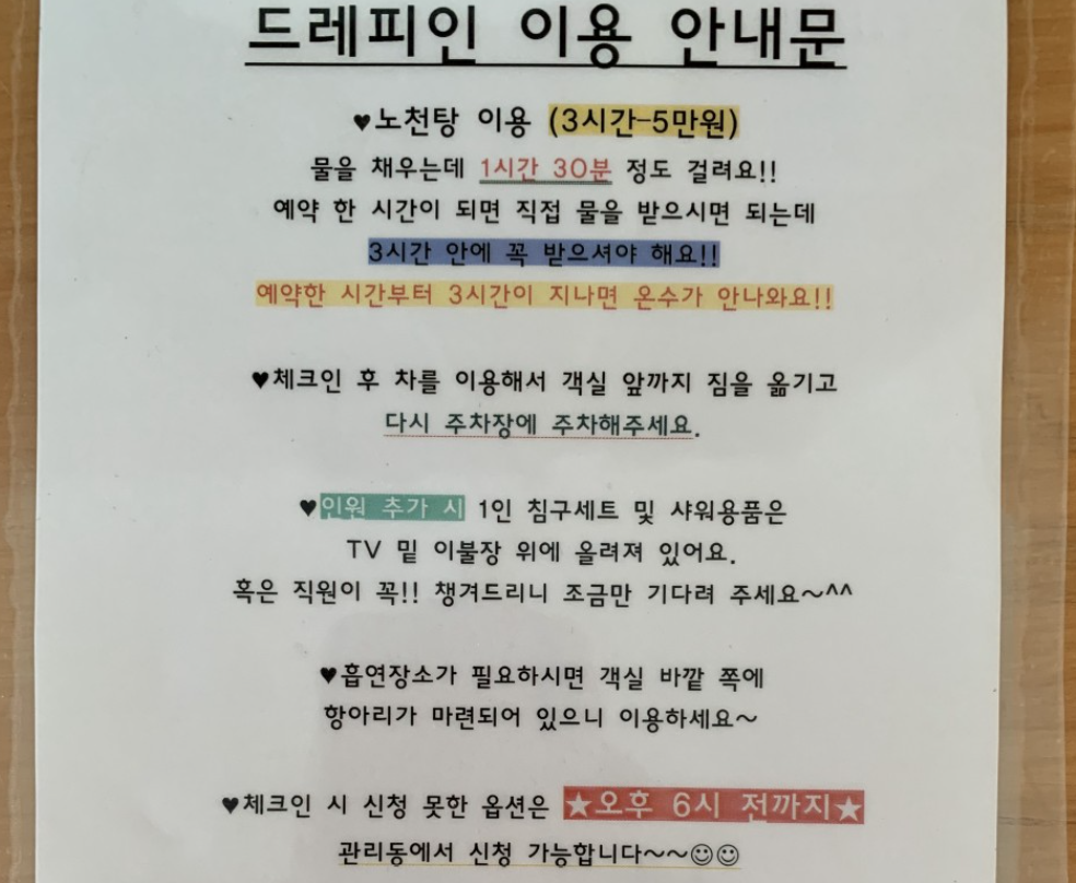 - 체크인 후 차를 이용해서 객실 앞에 짐을 두고 난 뒤 주차장에 주차해야 합니다.