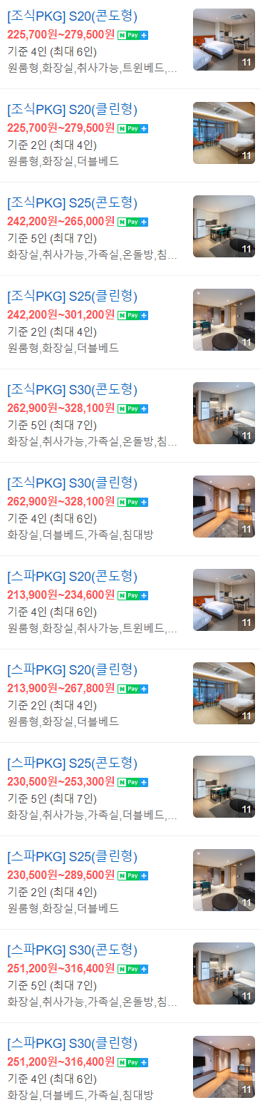 간단히 콘도형과 클린형으로 나눠져 있고, 패키지를 이용하는 것이 경제적인 예약입니다.