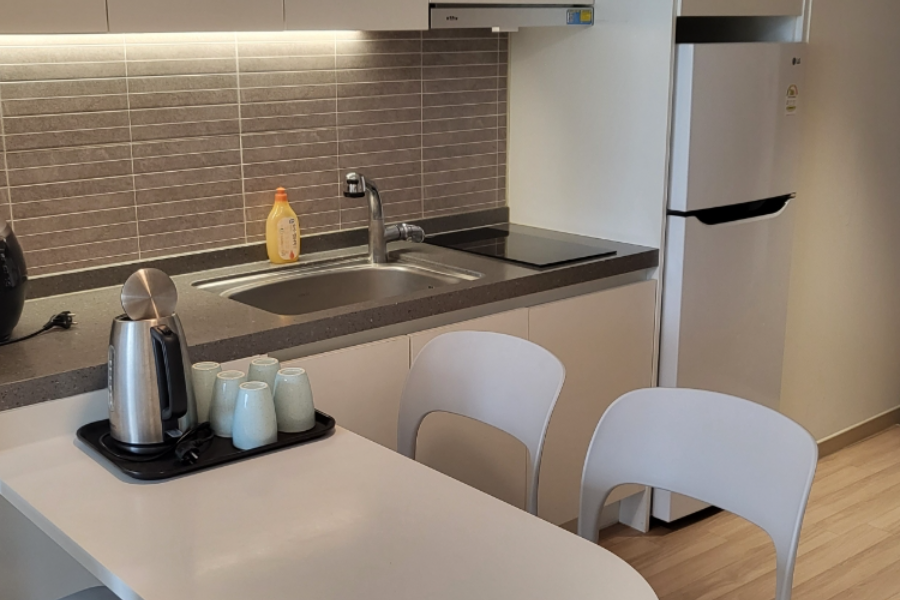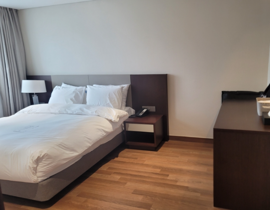 5인 기준 방이지만 4인용 테이블이 부엌에 있습니다. 침대방에는 넓은 베란다, 화장대가 있습니다. 온돌방은 아래와 같이 깔끔합니다. 플렉스타워에서는 조식을 먹으려면 스테이타워 1층으로 가야 합니다.