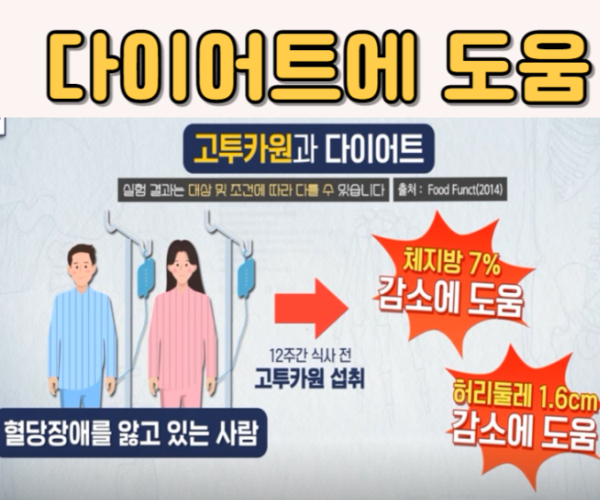 인체 적용 실험에서 빵과 설탕을 섭취한 뒤 고투카원 섭취 그룹의 식후 혈당이 대조군에 비해 각각 25%, 13% 낮았습니다. 쥐를 이용한 동물실험에서는 인슐린 분비량이 2배 이상 증가한 모습을 확인하기도 했다고 합니다.